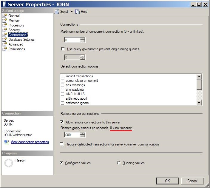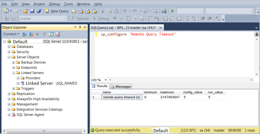 Under remote server connections, in the remote query timeout box, type or select a value from 0 through 2,147,483,647 to set the maximum number seconds for … If set to 0, the query timeout is infinite (the query does not time out). An example is a query to a linked server, in which case our sql server becomes a client to another server. You can check the current remote query timeout setting by running: 19/11/2015 · use the remote query timeout option to specify how long, in seconds, a remote operation can take before microsoft sql server times out.